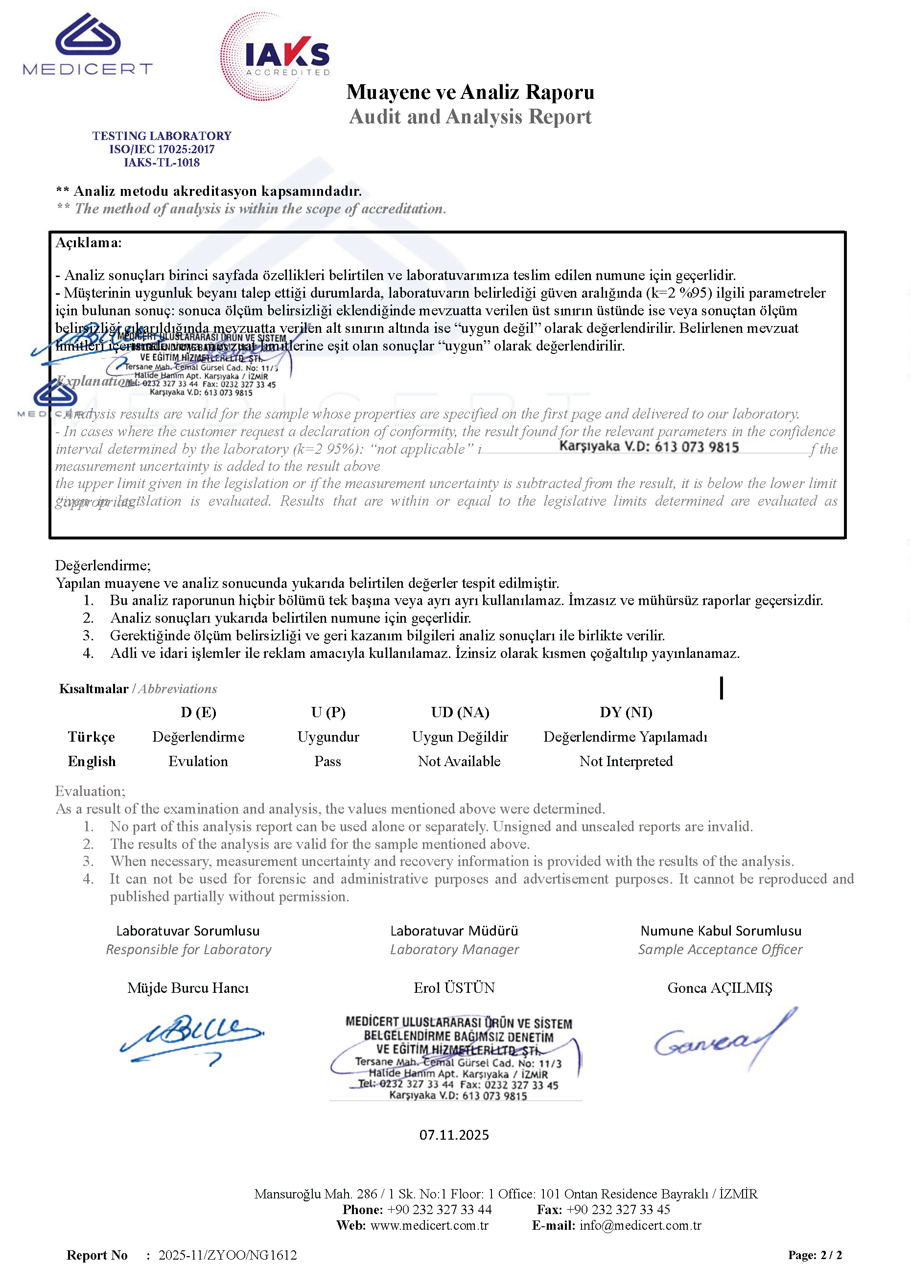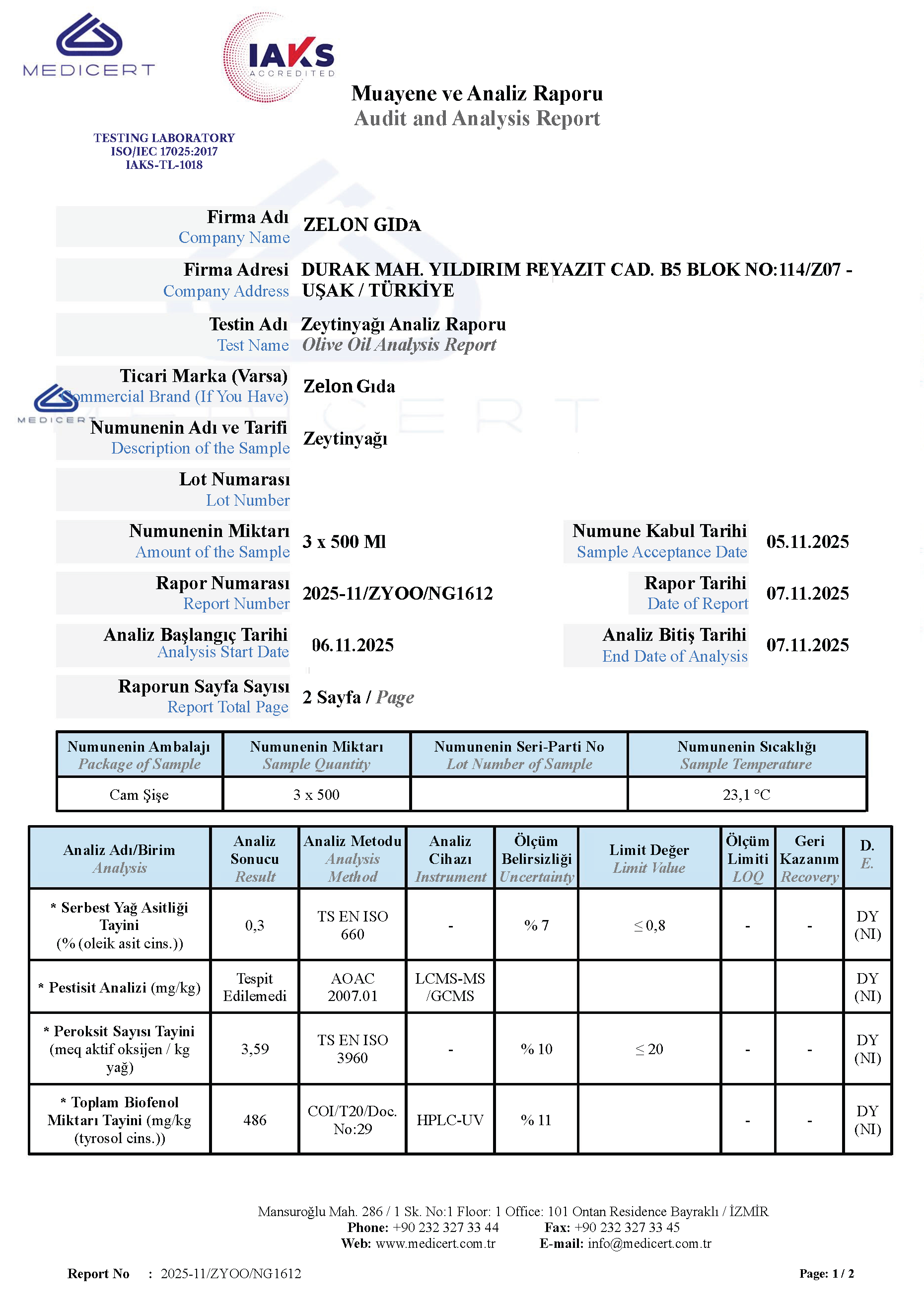 Zelon Ege'den olarak, ürünlerimizin kalitesini garanti altına almak için ulusal ve uluslararası standartlara uygunluk belgeleri ve ISO, organik sertifikaları gibi resmi belgelere sahibiz. Ayrıca, ürünlerimiz düzenli olarak laboratuvar testlerine tabi tutulur ve polifenol, asidite oranı gibi önemli parametrelerde yüksek kaliteyi kanıtlayan sonuçlar elde edilir. Bu belgeler ve testler, ürünlerimizin güvenilirliğini ve sağlığa uygunluğunu doğrulamaktadır.